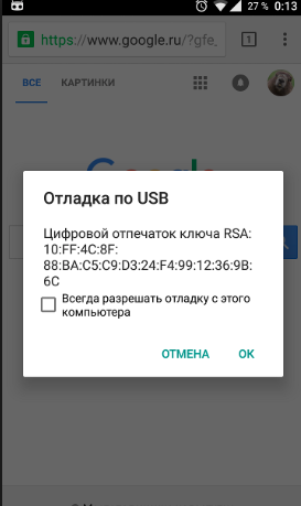 4. Держим телефон в разблокированном состоянии и постоянно посматриваем на экран т.к. в момент ввода следующих команд на экране выскочит уведомление и нужно будет дать разрешение на отладку для вашего ПК. Выглядеть окошко будет так: