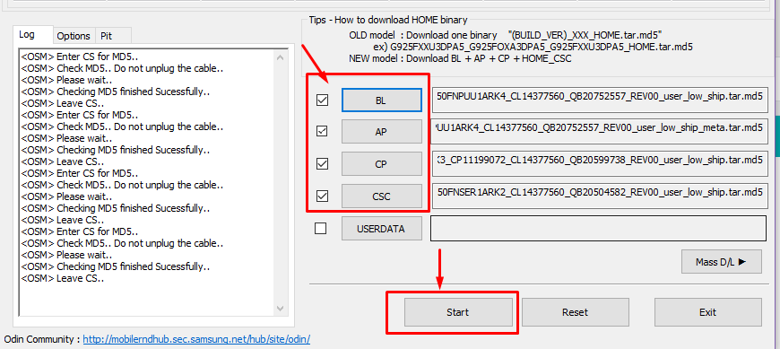 - если в поле CSC выбрать файл "CSC...tar.md5" -> производится полное форматирование, все пользовательские данные будут удалены (рекомендуется, т.к. при переходе с одной прошивки на другую могут "повылазить баги")