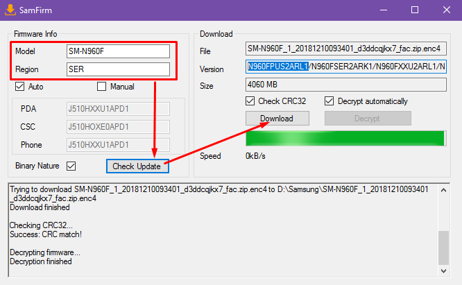 (заполнить поля указав модель и регион, затем нажать кнопку "check update", затем "download")
