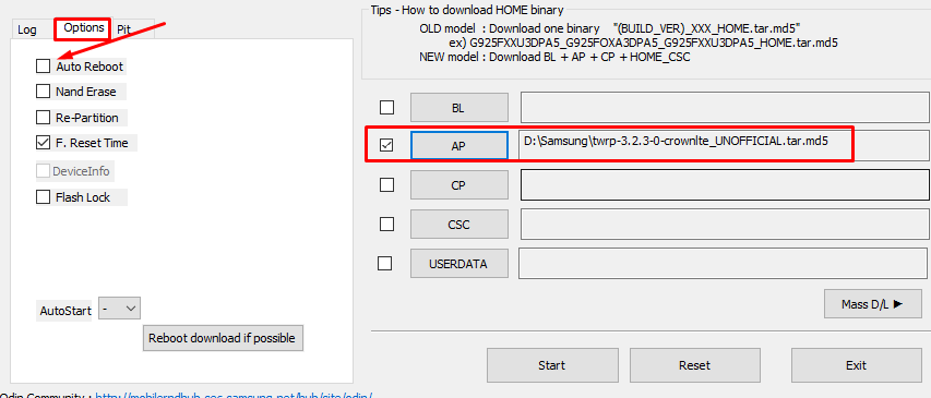 4. Запустить Odin. Открыть опции и снять галочку с "Auto reboot". В поле "AP" выбрать tar-файл с образом TWRP recovery. twrp-3.2.3-0-crownlte_UNOFFICIAL.tar.md5
