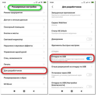 2.1. Открываем опции для разработчика. Для этого идём в Настройки -> О телефоне и там тапаем пальцем 8 раз по "Версия MIUI". Затем идём в Настройки -> Расширенные настройки -> Для разработчика и там включаем: "Отладка USB"