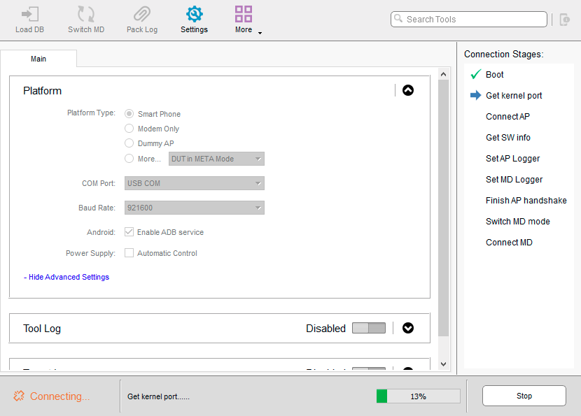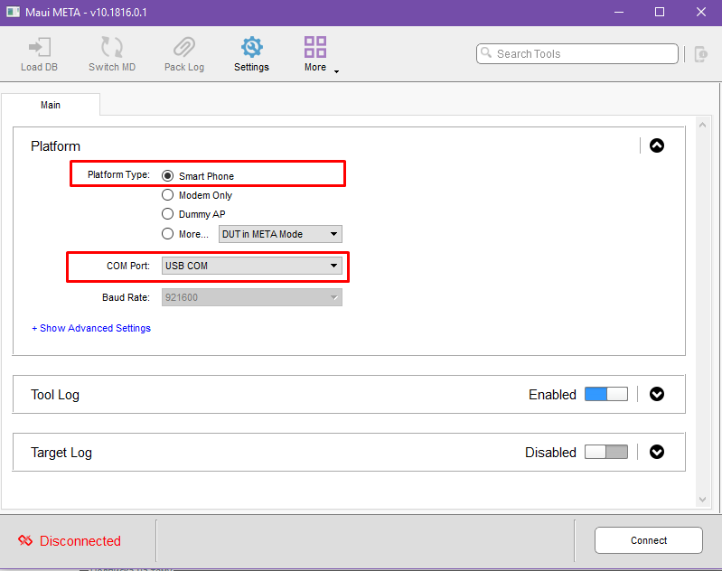 2. Запускаете Maui META. Убеждаетесь что в поле "Platform Type" выбраны: "Smart Phone", а в "COM Port": "USB COM".