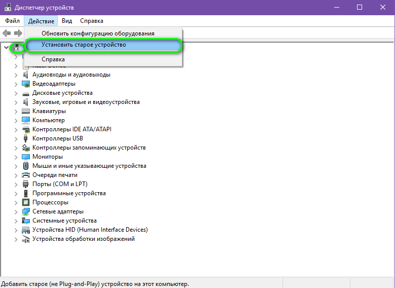 - Открываем диспетчер устройств. Делаем подсвеченным "ваш компьютер" нажав один раз по "Win-XXXXXXX". Нажимаем "Действие" и выбираем "Установить старое устройство".