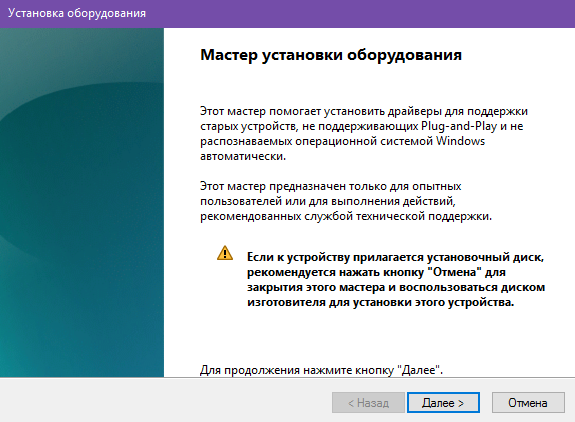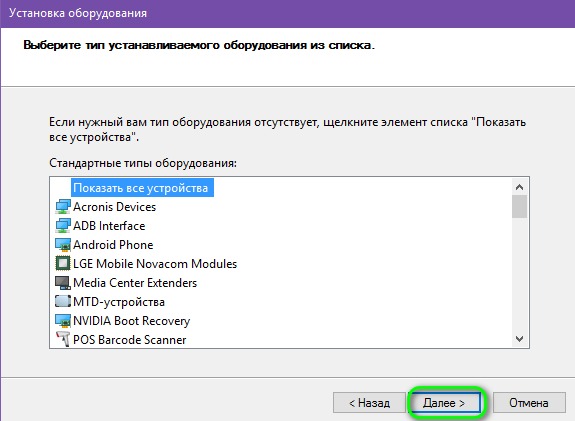 - Жмём "Далее" -> в следующем окне выбираем "Установка оборудования, выбранного из списка вручную"