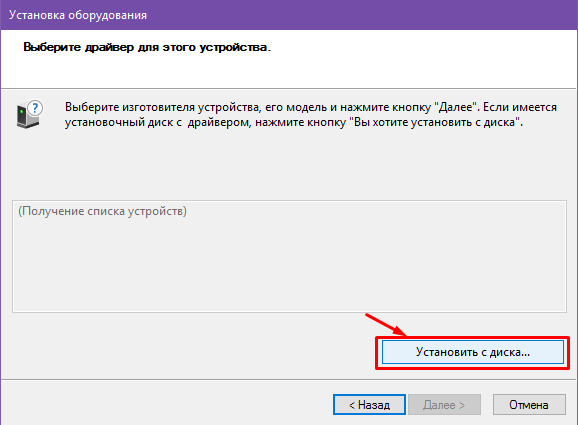 - Жмём "Далее" и в следующих окнах нажимаем на "Установить с диска"