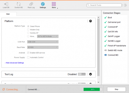 3. Нажимаете "Connect" в правом нижнем углу окна программы и сразу подключаете выключенный телефон. В программе начнётся процесс инициализации устройства.