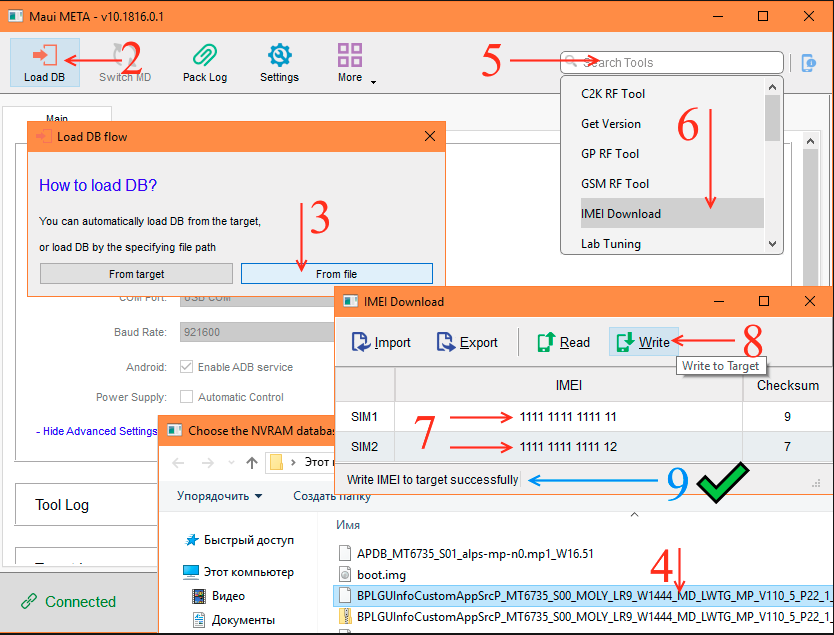 6. Нажимаем "Write" (8) и при успешном результате, радуемся надписи "Write IMEI to target successfully" (9).