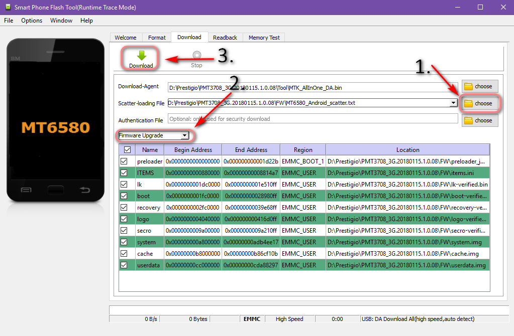 4. Нажать кнопку "choose" на против поля "scatter loading file" и выбрать файл MT6580_Android_scatter.txt из папки "FW".