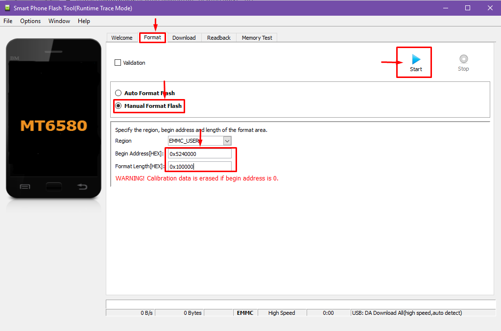 4. Выбрать "Manual Flash Format" и вписать следующие значения: