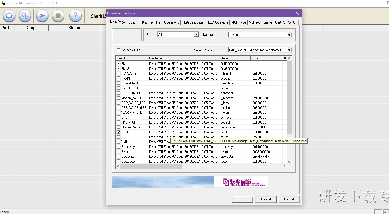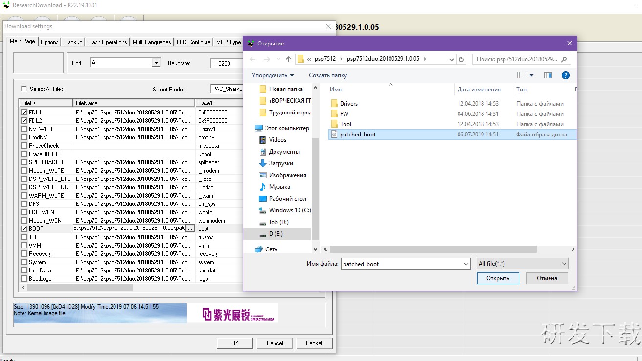 4. Откроется проводник. Выбираешь файл boot.img, который ты скопировал на телефон ранее. Ждёшь пока пропатчится ядро. 5. Готовое пропатченной ядро будет находится по пути /storage/emulated/0/Download/ с именем patched_boot.img. Копируешь его на компьютер. 6. Затем скачиваешь ResearchDownload (прикрепил к посту). Распаковываешь. Запускаешь. 7. Нажимаешь на шестерёнку и выбираешь pac-файл с прошивкой. 8. Затем как прошивка распаковалась - нажимаешь на две шестерёнки.