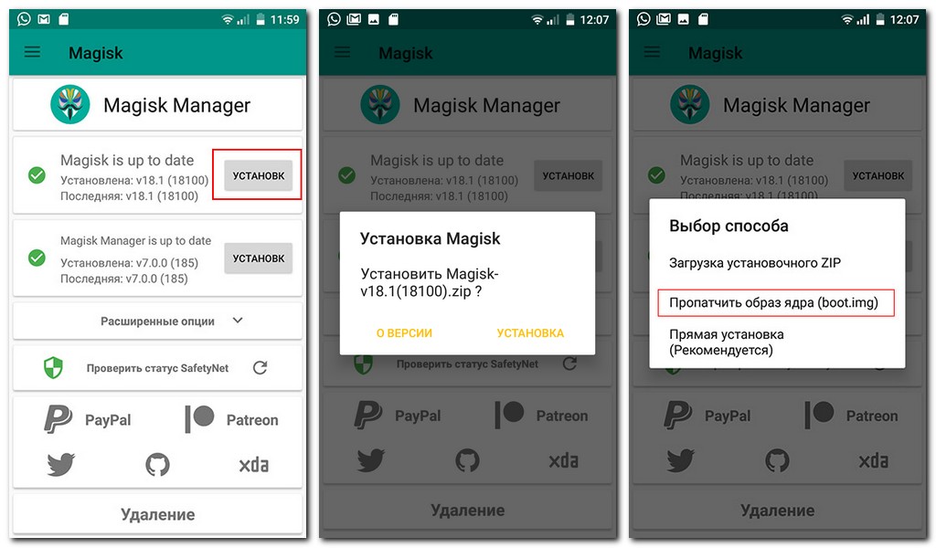 1. Устанавливаешь Magisk Manager. (прикрепил к посту) 2. Скачиваешь архив с ядром (я извлёк его из прошивки). Распаковываешь, файл boot.img копируешь на телефон. 3. Запускаешь Magisk Manager. Там нажимаешь на верхнюю кнопку "УСТАНОВКА". Попросит установку Magisk. Жмешь "установка". В следующем окошке выбираешь "Пропатчить образ ядра (boot.img)"