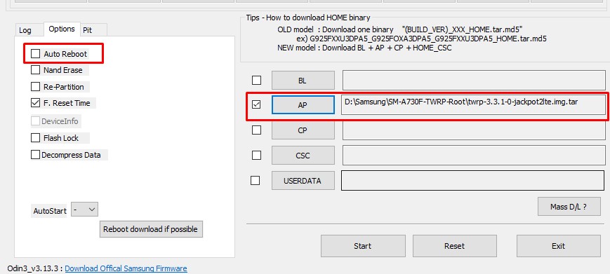 4. Запускаем программу Odin. Открываем вкладку с опциями и снимает галочку с "Auto-reboot". Затем нажимаем на кнопку "AP" и выбираем файл twrp-3.3.1-0-jackpot2lte.img.tar