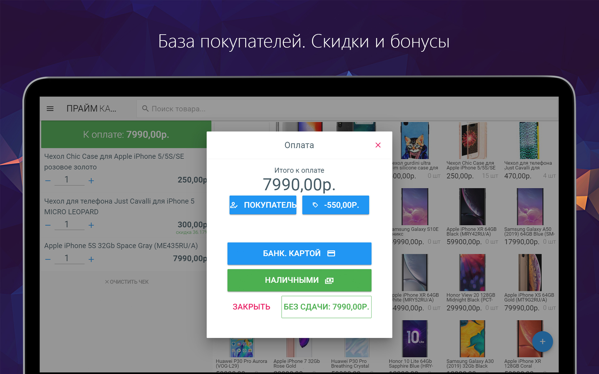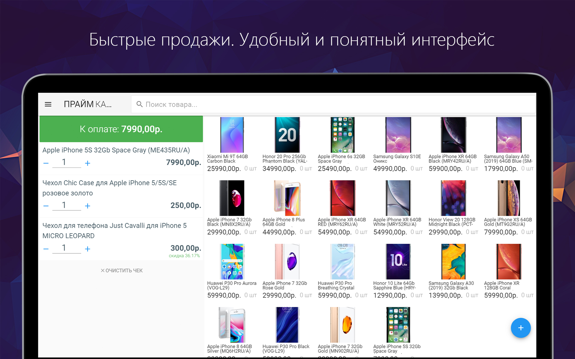 Бесплатное приложение Касса Прайм превратит любой планшет или смартфон в полноценную кассу. Разработано специально для магазинов розничной торговли. Соответствует 54-ФЗ - для печати чеков подключите фискальный регистратор Атол.