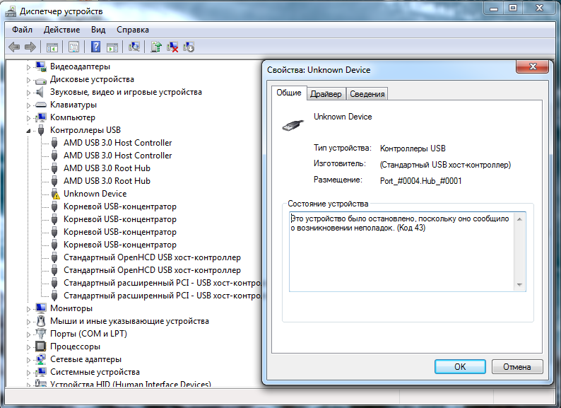 Пробовал менять порта USB, USB-шнур, драйвера. Один раз компьютер опознал устройство и установил драйвера. Начал прошивать Одином, выскочила ошибка и телефон снова не распознаётся, код 43.
