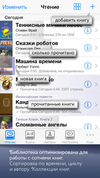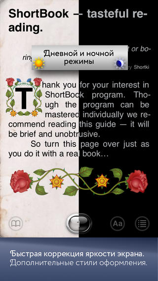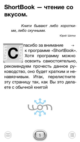 Чтение книг на портативных устройствах — всегда компромисс комфорта чтения и оперативной доступности текста. ShortBook предлагает оригинальное решение этой проблемы благодаря внимательному подходу к вёрстке текста на ограниченной площади экрана iPhone. Множество экспериментов с различными вариантами композиции текста и организации интерфейса «выкристаллизовали» уникальное сочетание для комфортного чтения. Если Вам нужно читать долго, с удобством и без существенного вреда для зрения, воспользуйтесь программой ShortBook — ридером high-end класса.