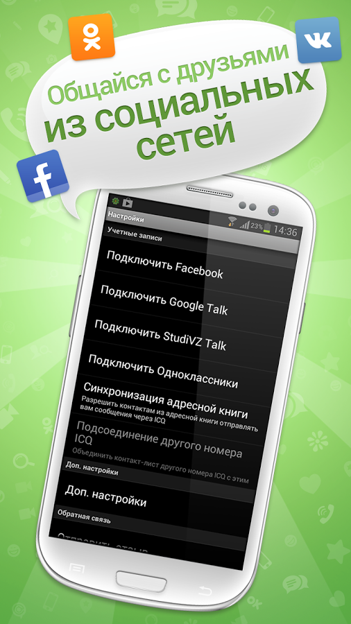 — Обменивайтесь мгновенными сообщениями с друзьями из Одноклассников, ВКонтакте, Агента Mail.Ru, Facebook и Google+.