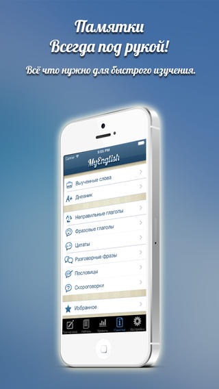 Изучение английского кажется Вам тяжелым? Не расстраивайтесь. Мы верим, что английский можно изучать с легкостью.И все свои идеи мы постарались реализовать в приложении MyEnglish. Это уникальная в своем роде программа для изучения английского языка. Достаточно всего 15 минут в день, и через месяц Вы окажетесь на совершенно новом уровне английского языка.