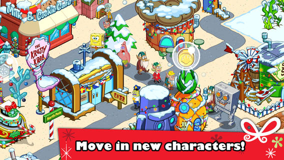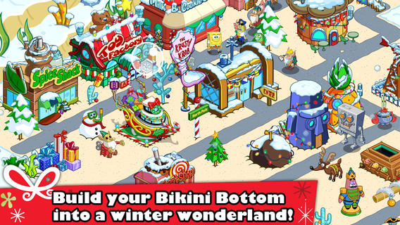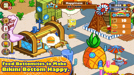 Погрузитесь в первый день жизни Губки Боба в Бикини Боттом! Поселите его в Доме-ананасе, устройте работать в Красти Краб, и отстройте свой собственный Бикинни Боттом! С превращением вашего города в процветающий подводный мегаполис, вы откроете новых персонажей, здания, украшения, и территории, вроде Медузьих полей.