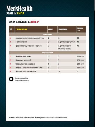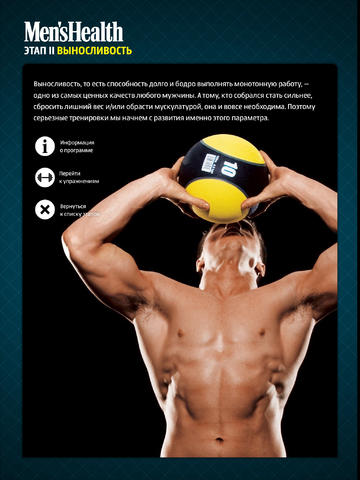 «Персональный тренер Men's Health Russia» — приложение о том, как всего за 12 месяцев обрести идеальную физическую форму. В роли твоего персонального тренера выступит фитнес-редактор MH Дмитрий Смирнов, а также знаменитые фитнес-инструкторы Джон Берарди и Тод Деркин. Программа состоит из 5 этапов: подготовительного, развития выносливости, гипертрофии, укрепления силы и сушки. Тебя ждут инструкции по выполнению сотни упражнений с комментариями экспертов о возможных ошибках. К концу последнего этапа твое отражение в зеркале можно будет смело поместить на обложку Men's Health.