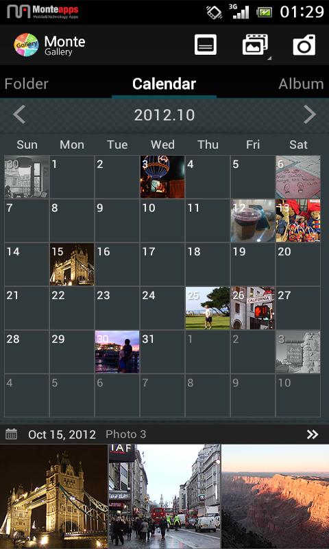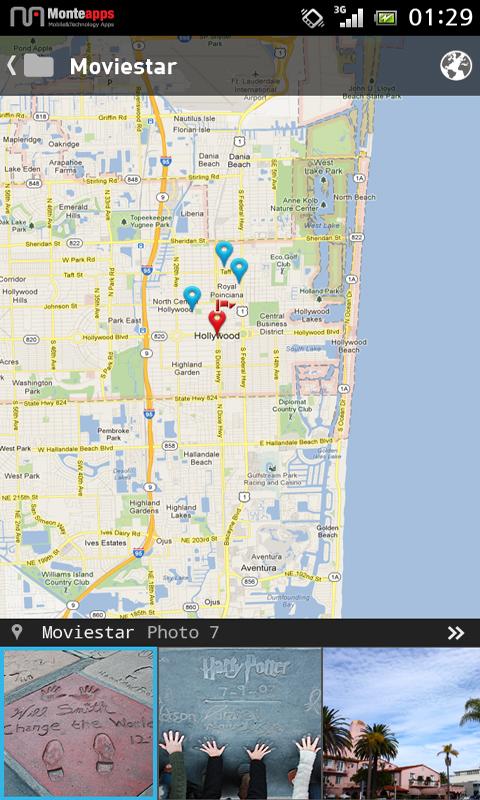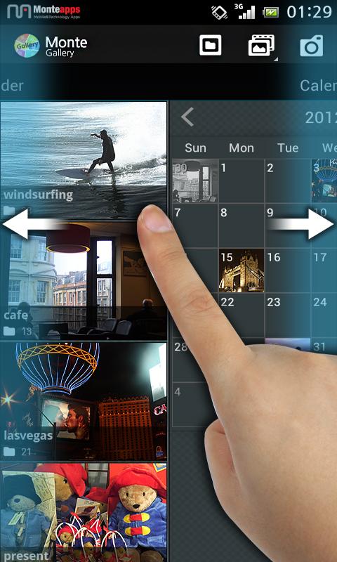 Monte Gallery - приложение для просмотра изображений. Предоставляет множество функций и разные виды сортировки: по дате, по месту, собственные классификации. Кроме того, возможно создавать заметки в фотографиях (текстовые и аудио), ставить пароль блокировки на выбранные папки, воспроизведение музыку с различными эффектами во время слайд-шоу.