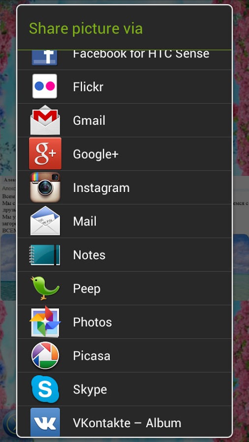 - Делитесь с друзьями по: e-mail, SMS, Facebook, twitter, вконтакте, google+, skype, bluetooth, picasa, одноклассники, icq, и др.
