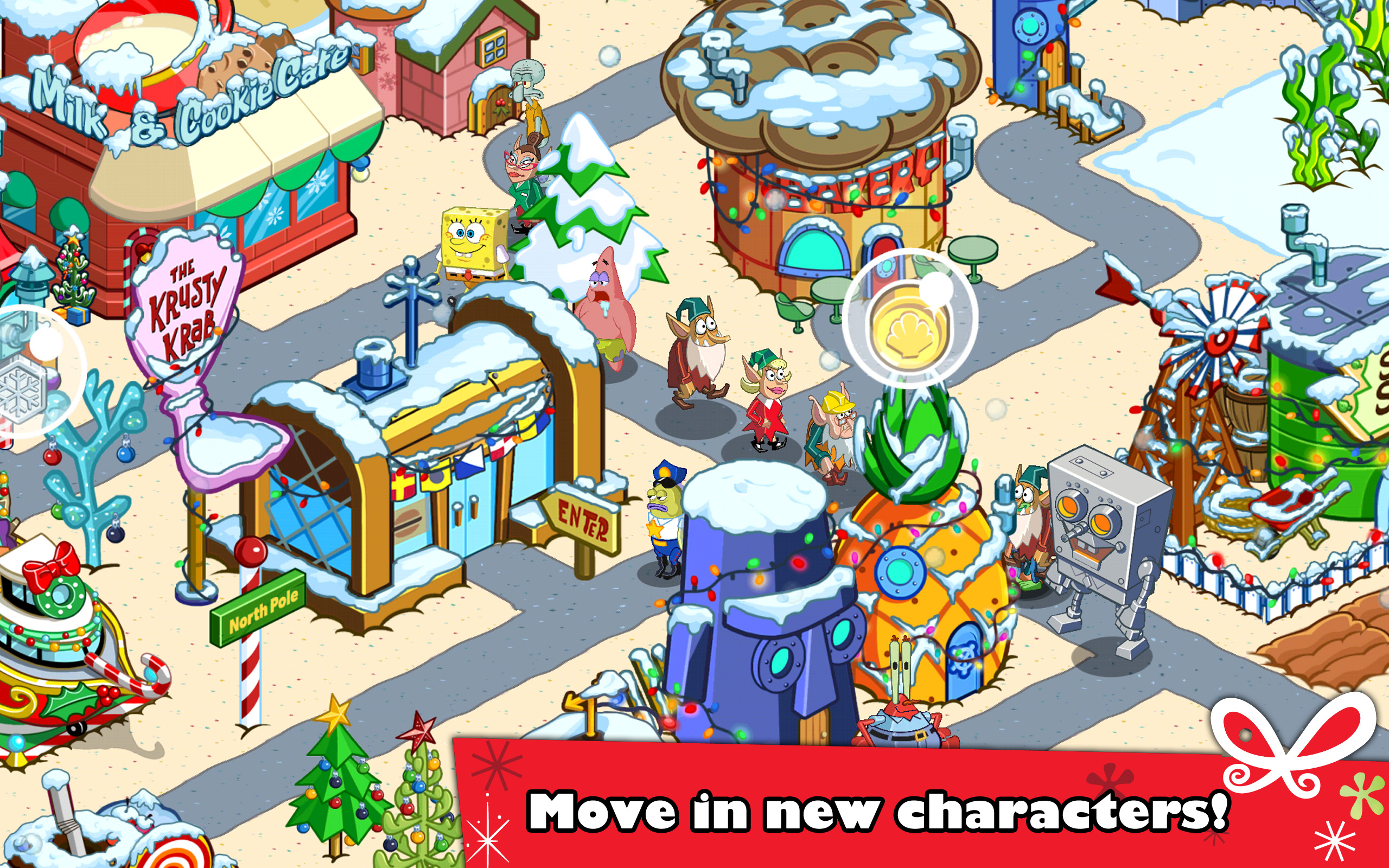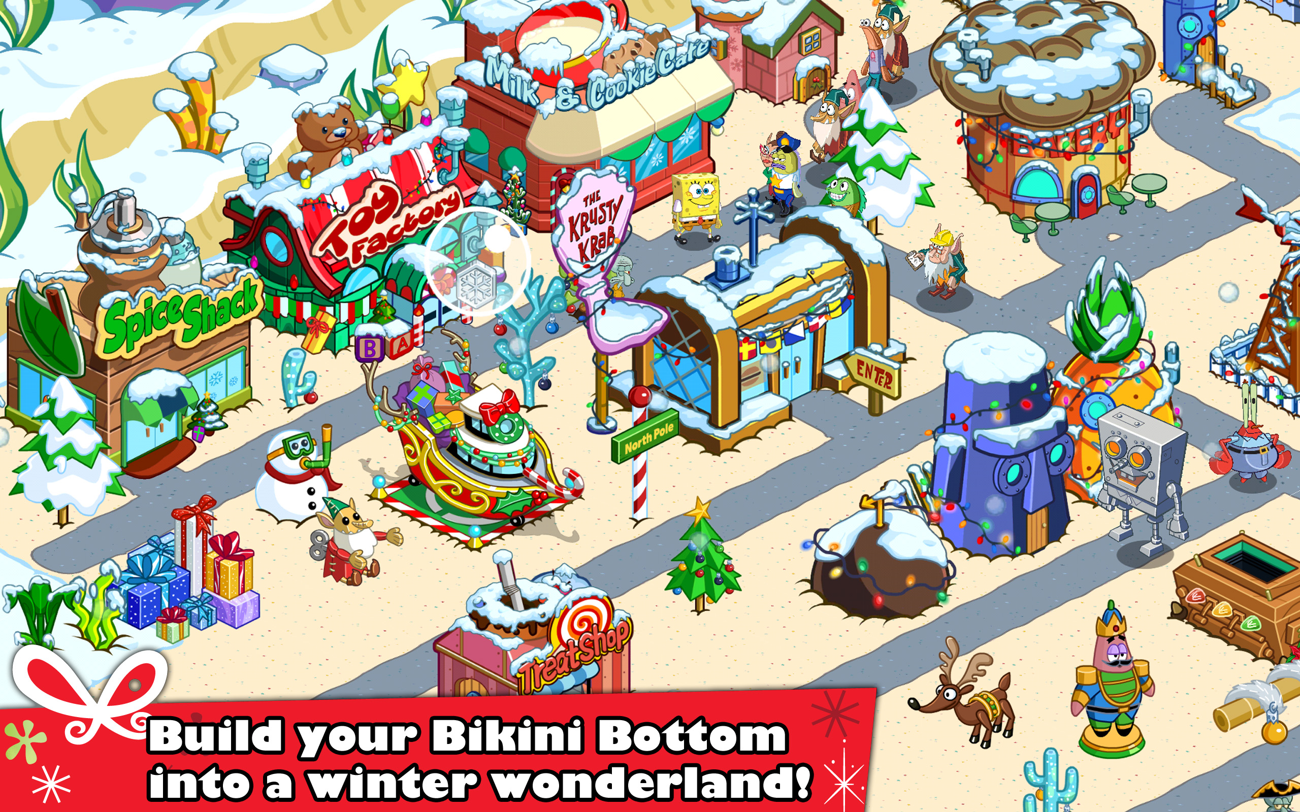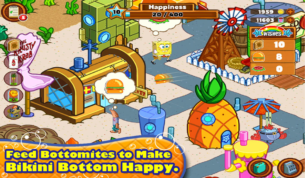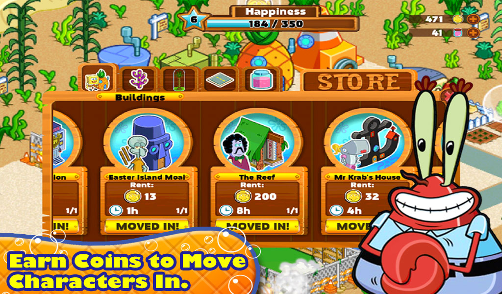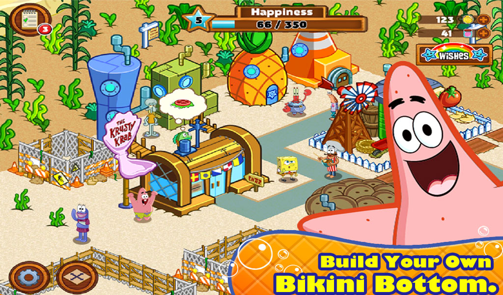Погрузитесь в первый день жизни Губки Боба в Бикини Боттом! Поселите его в Доме-ананасе, устройте работать в Красти Краб, и отстройте свой собственный Бикинни Боттом! С превращением вашего города в процветающий подводный мегаполис, вы откроете новых персонажей, здания, украшения, и территории, вроде Медузьих полей.