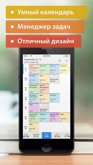 Это первый умный календарь для iPad. Приложение эффективно использует большой экран, отображая больше информации и позволяя ею легче манипулировать.
