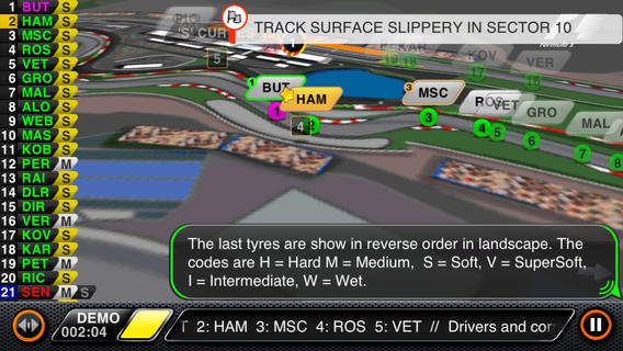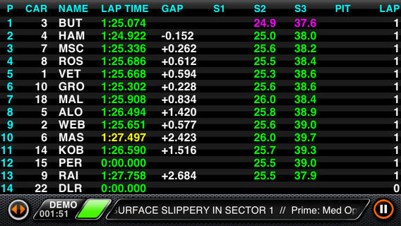 Будь вы на гоночной трассе или смотрите гонку дома, F1 timing приложение поможет вам быть ближе к действию. С нового сезона приходит новый производитель шин и пит-стопы, вероятно, станут немалой частью чемпионата (теперь возможно 3 и более пит-стопов для каждого водителя на каждой гонке. Имея это в виду, отслеживать позиционирования с помощью этой программы будет неоценимой поддержкой во время гонки.