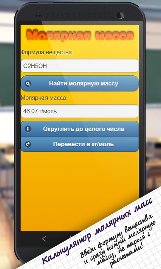 С приложением "Химия X10" можно легко найти молярную массу любого вещества или химического соединения, всего лишь надо ввести его формулу, например, C2H5OH. Полученный результат можно мгновенно округлить до целого числа и перевести в кг/моль.