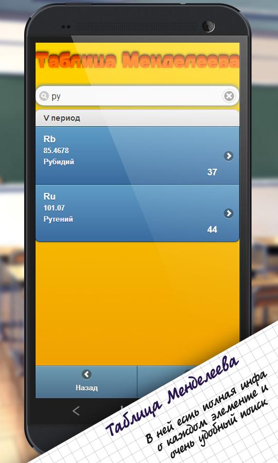 Удобная, ориентированная под мобильные телефоны, таблица Менделеева с умным поиском содержит в себе полную информацию о каждом элементе (кто открыл, из какой стран, физические свойства электронную конфигурацию, строение решетки и т.д.)