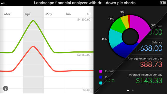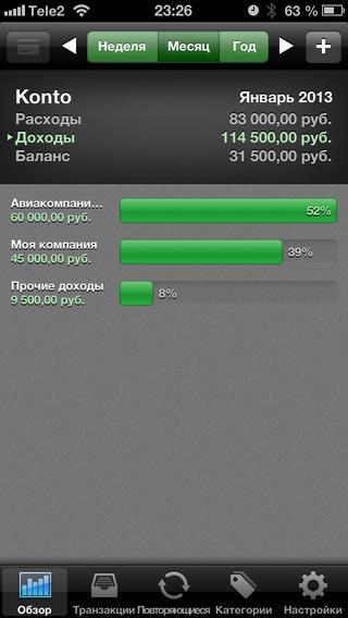 1. Недельный, месячный и годовой обзор с удобной и наглядной диаграммой, на которой отображаются Ваши расходы и текущий остаток денег.