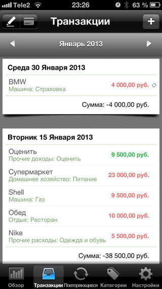 2. После ввода доходов или расходов в приложение, на экране появляется список с суммой остатка на каждый день. Для дополнительного удобства в приложении также имеется возможность однократно вводить повторяющиеся транзакции.
