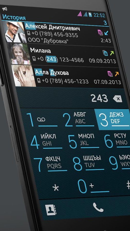 • Быстрый и настраиваемый Т9 поиск по всем полям контактов и истории звонков
