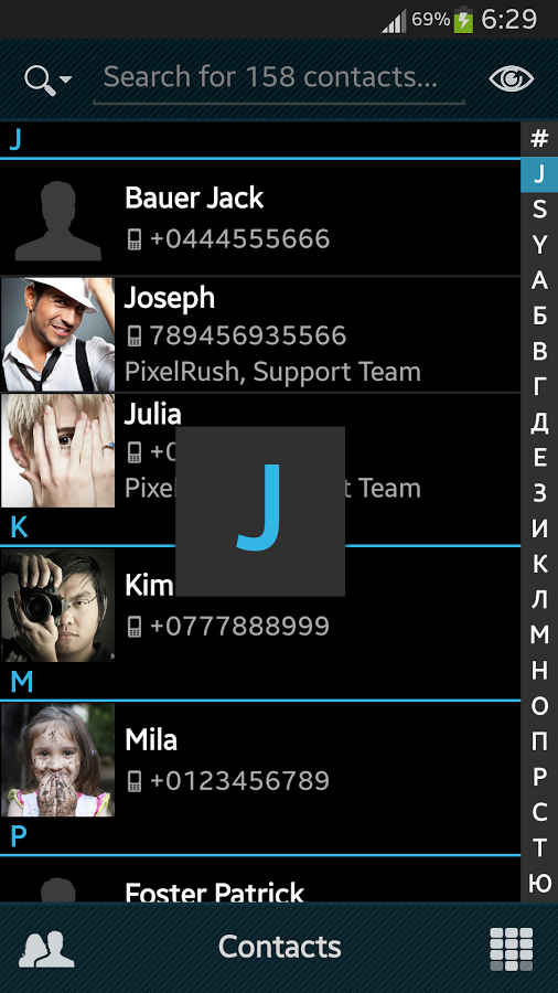 • Быстрый переход к контактам с помощью полосы прокрутки ABC