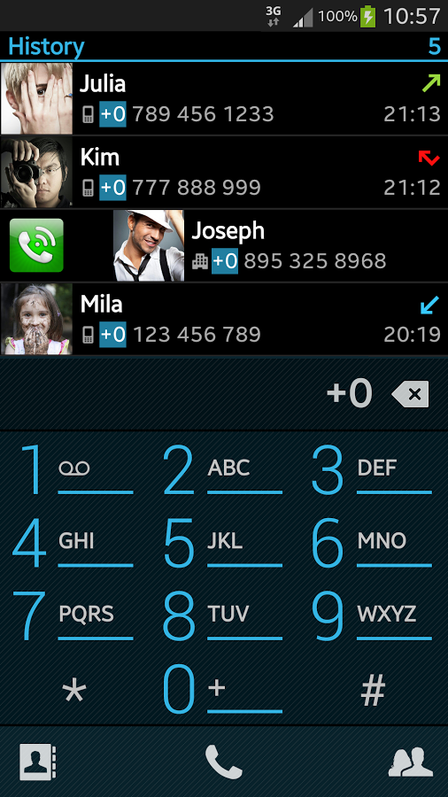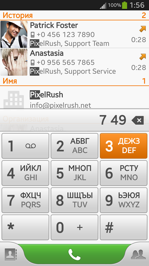 • Быстрое переключение между данными контакта и его историей звонков (нижняя панель)