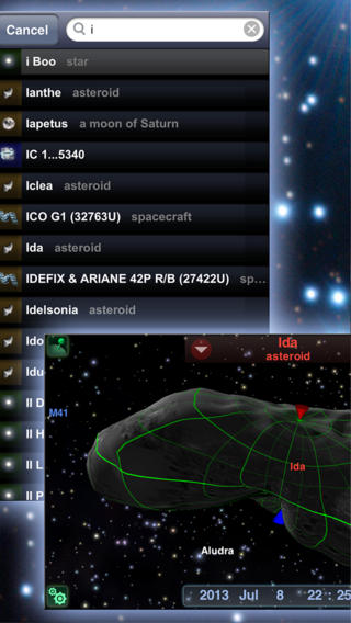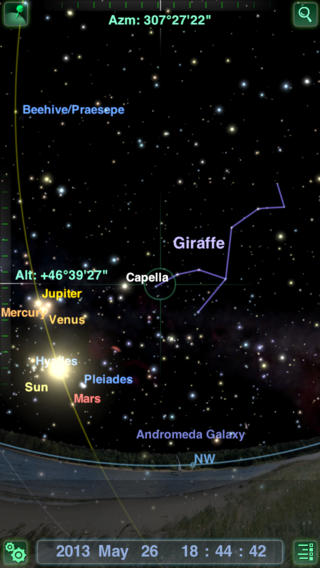 - поиск звезд/планет: режим телескопа с использованием акселлерометра и компаса (для моделей 3GS и 4). Включите режим "Follow Sky" и вы получите информацию о светилах, находящихся прямо у вас над головой.