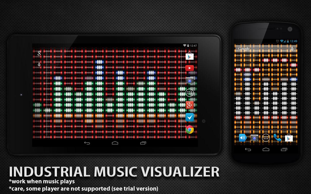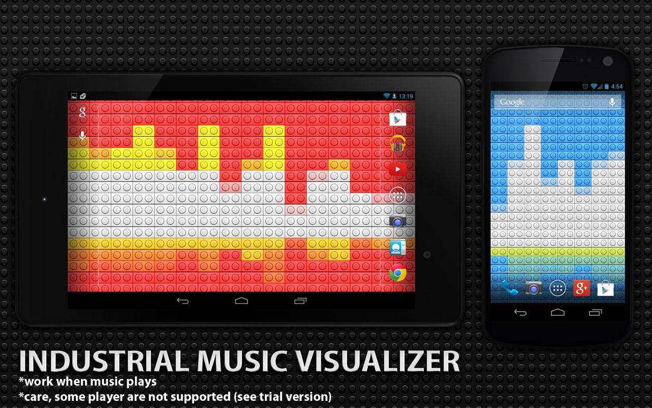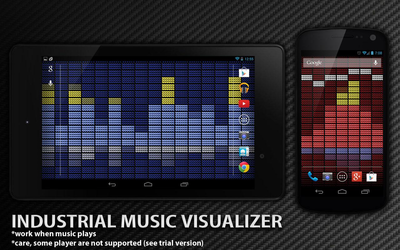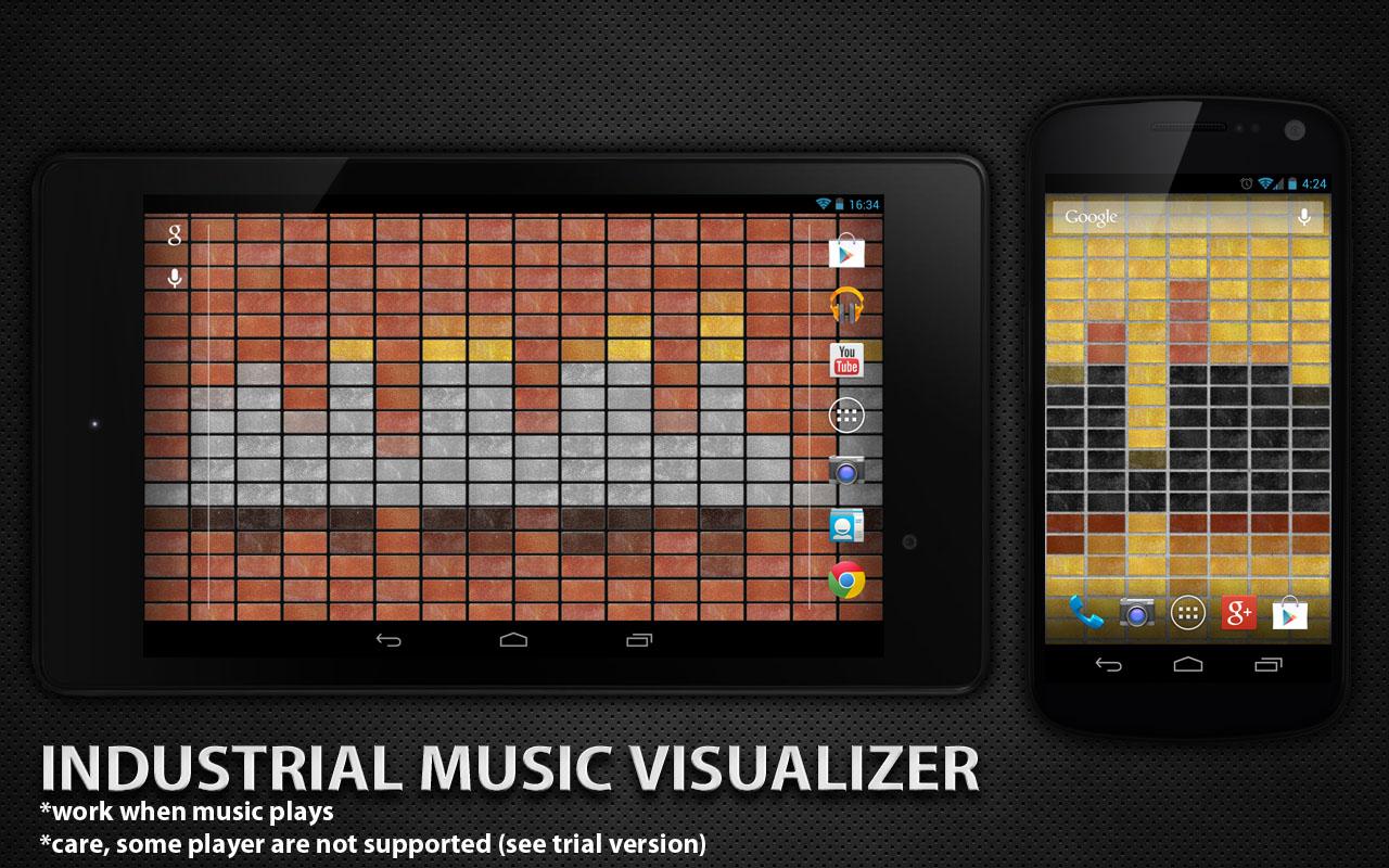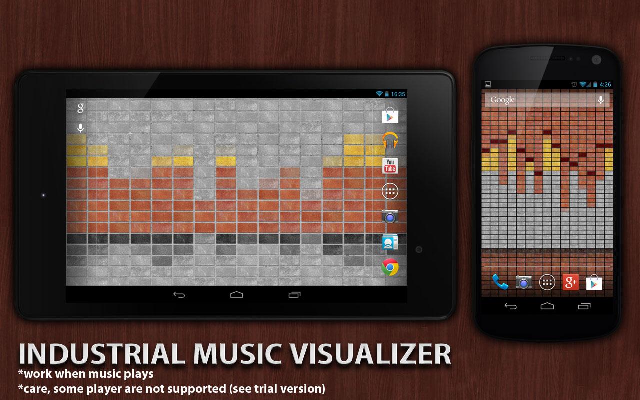 Живые обои являются визуализатором музыки в индустриальном стиле. Возможен выбор одной из нескольких предустановленных тем или полностью ручная настройка. Возможно включение анимации в отсутствие звука.