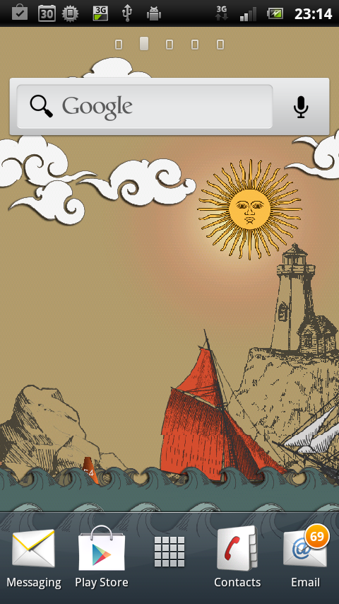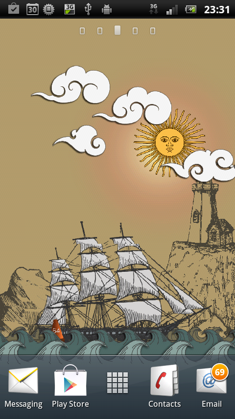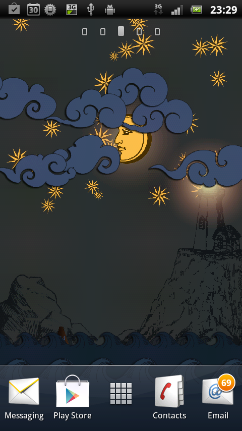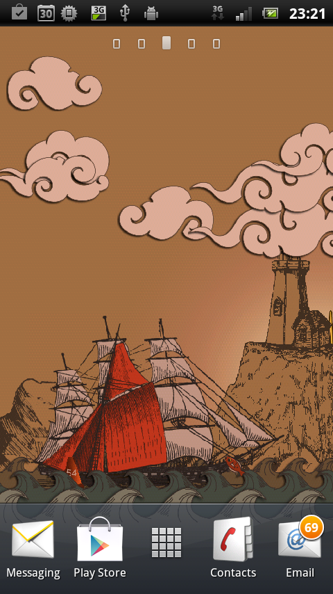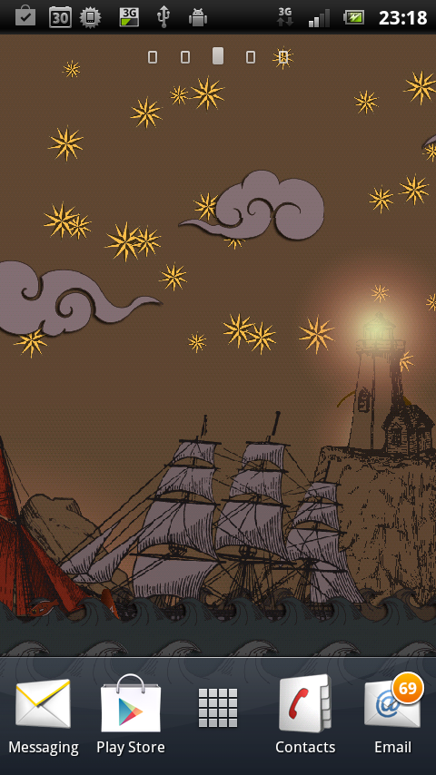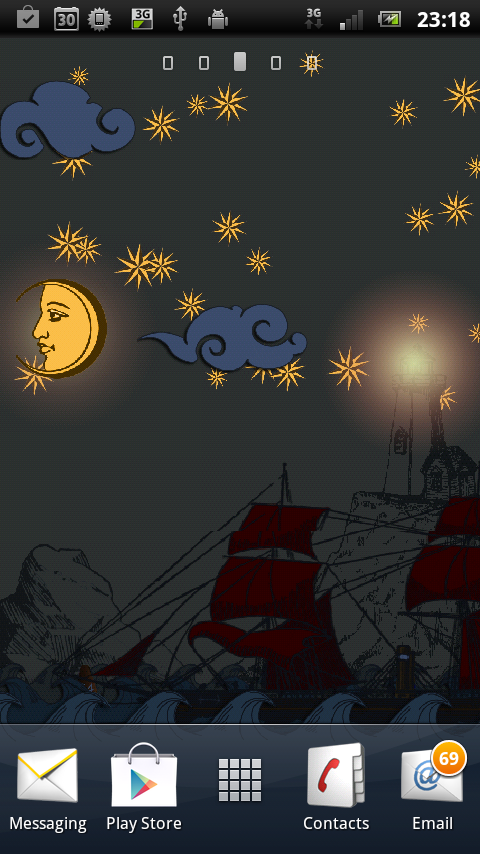 Живые обои выполнены в технике рисунка и содержат красивые старинные корабли, маяк, живое море, рыбок, выпрыгивающих из воды, курчавые облака... Солнце и луна встают и опускаются в соответствие с реальным временем, но можно выбрать режим только дня или ночи, а также режим свободной настройки времени.