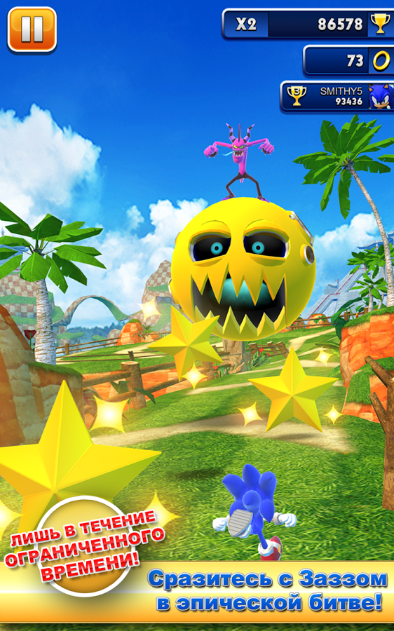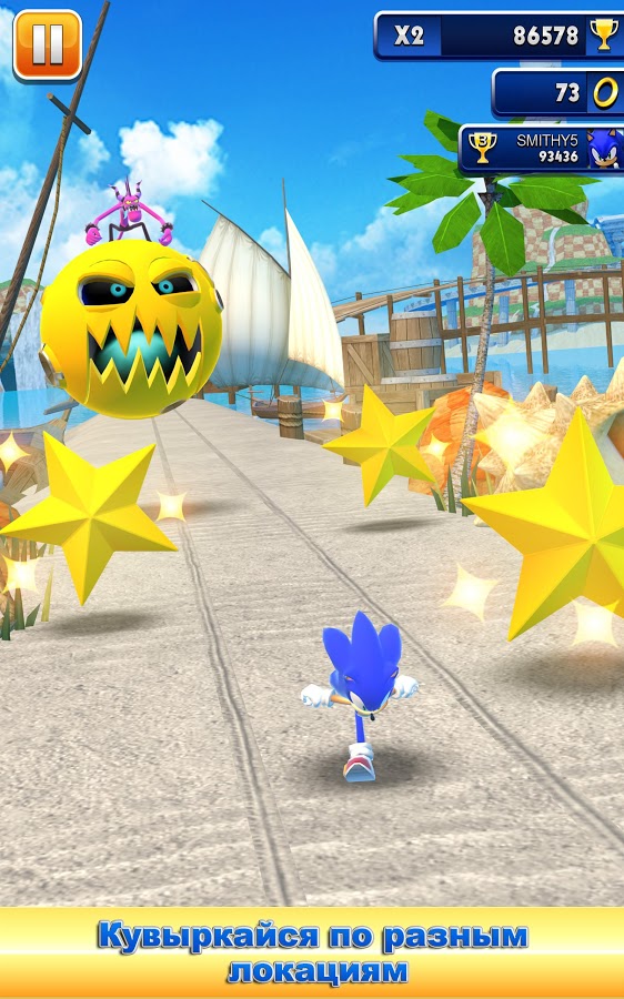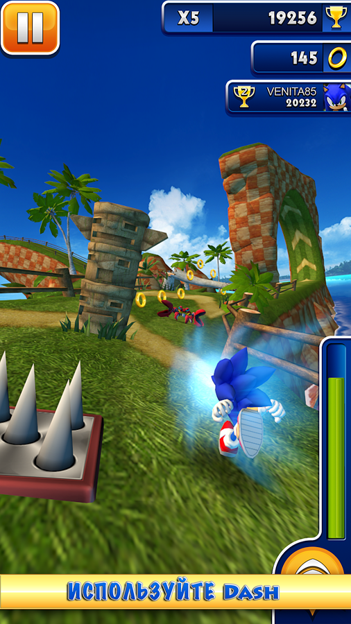 Sonic Dash - потрясающая портированная аркада для Вашего мобильного устройства. Знаменитый еж по имени Соник появляется в первой бесконечной игре-бегалке. Далеко ли вы убежите? Используйте невероятное движение Соника – бросок (dash). Это позволит разгоняться и бегать (run) с безумной скоростью, сбивая все на своем пути! Способности Соника помогут увертываться от опасностей, перепрыгивать через препятствия и делать мертвые петли, а разрушительная самонаводящаяся атака поможет ему расправиться с врагами!