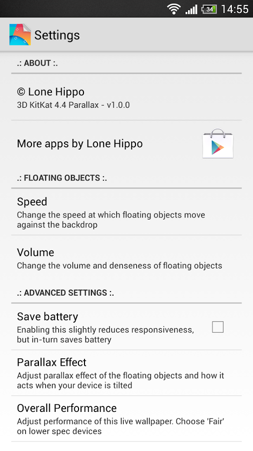 Потрясающие живые обои для мобильных устройств с отличным эффектом параллакс подарят вам истинное удовольствие от просмотра. Обои реагируют на положение вашего телефона, вращая его под разными углами, картинка на экране будет меняться в зависимости от движения смартфона. Вы можете настраивать скорость движения картинок и другие параметры. Чтобы получить прикольные картинки для телефона, достаточно скачать приложение Nexus KitKat 4.4 Parallax LWP для Android. Также есть возможность экономии заряда аккумулятора благодаря специальному режиму пониженной производительности.