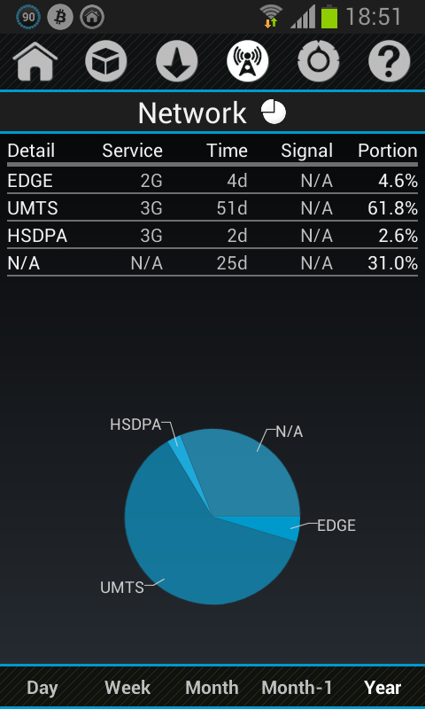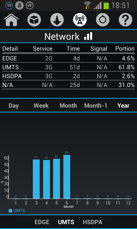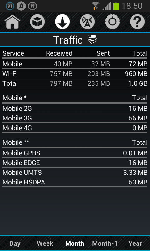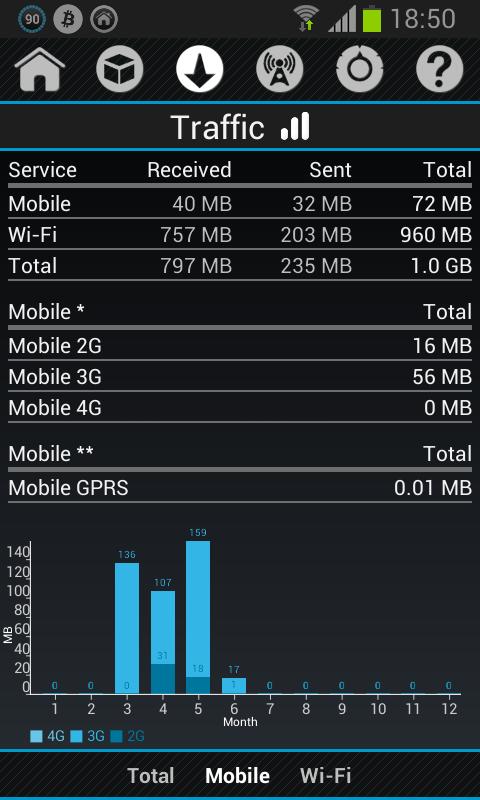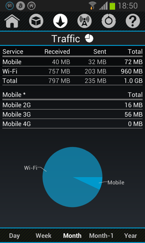 • графики и статистика для мобильной передачи данных и Wi-Fi