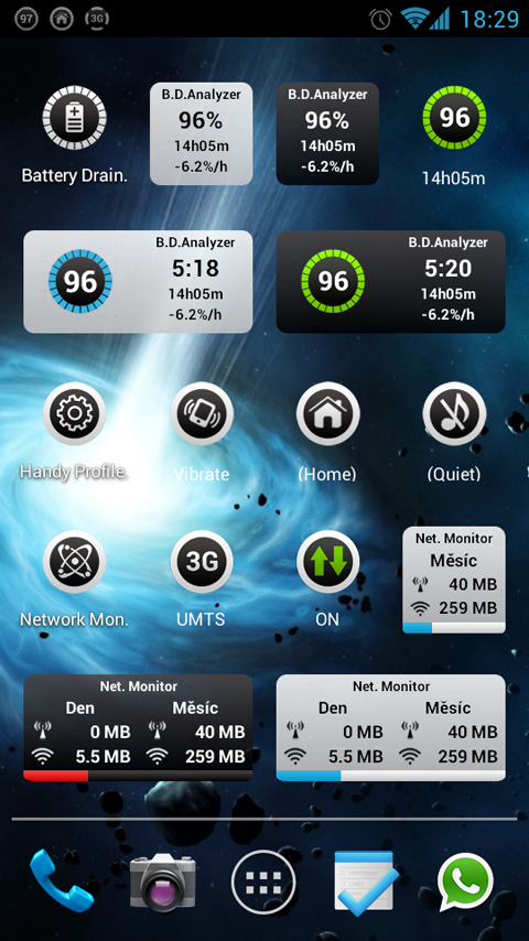 • widget switch (виджет переключатель) - включить/выключить мобильную передачу данных, синхронизацию, Wi-Fi, Wi-Fi привязку/точку доступа (хот-спот)