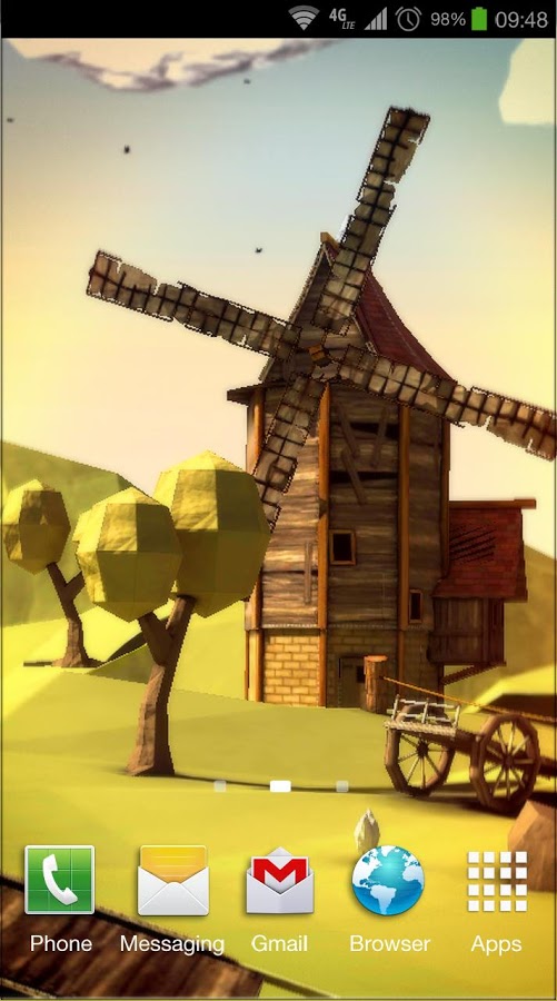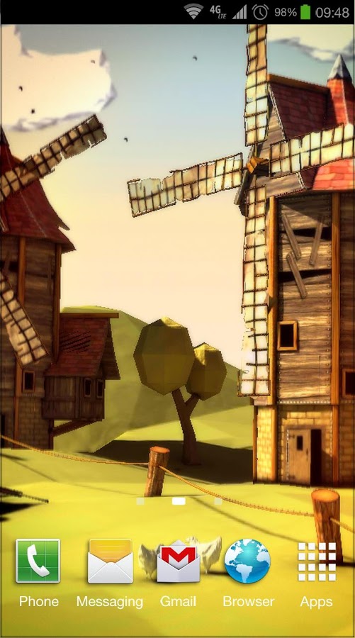 Приятные и не напрягающие живые обои для Андроид устройств, выполненные в бумажном стиле. Зеленый луг, овечки, плывущие по небу облака и старые ветряные мельницы, лопасти которых продолжают вращаться от легкого дуновения летнего ветерка. Мило, просто и в то же время стильно.