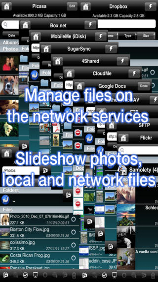 С SuperFiles от ArlexSoft вы можете обратиться к своим Google Docs/Mobile Me iDisk/Dropbox/WebDAV/Picasa/Flickr разнообразным учетным записям, просматривать документы, документы OCR, перевести на 52 языка, upload/download файлы, используя Web-браузер, посылать по электронной почте, анонсировать, создавать текстовые документы, преобразовывать в различные форматы (включая pdf), upload/download из/в Google Docs, ftp server, iDisk, Dropbox, Picasa, Flickr, zip/unzip файлы, хранить файлы локально, проигрывать музыку и видео, иметь полный доступ к библиотеке фотографий через web-браузер и другое…