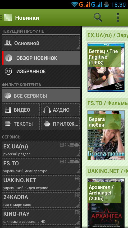 - фильтрация сервисов по типу контента;