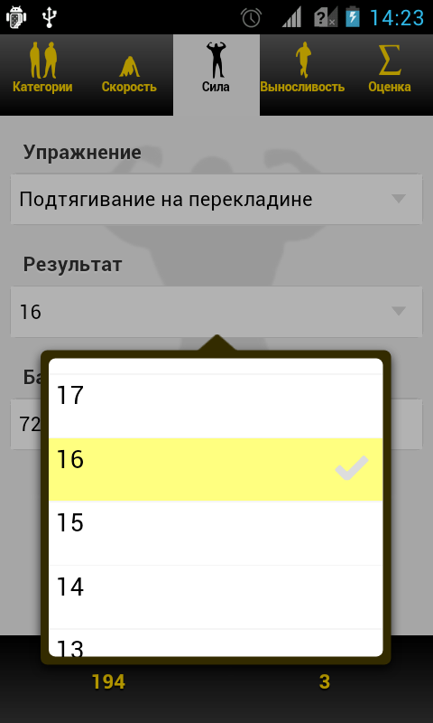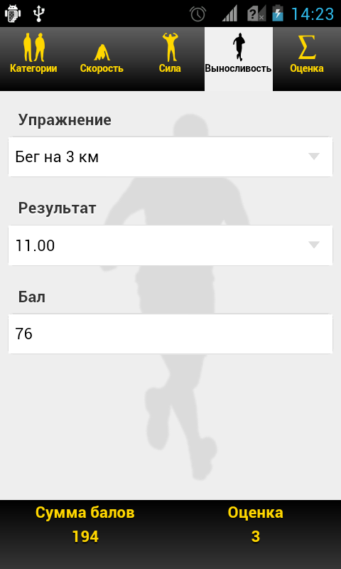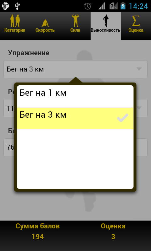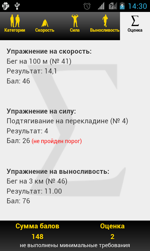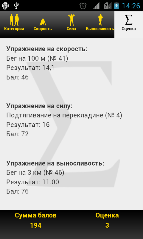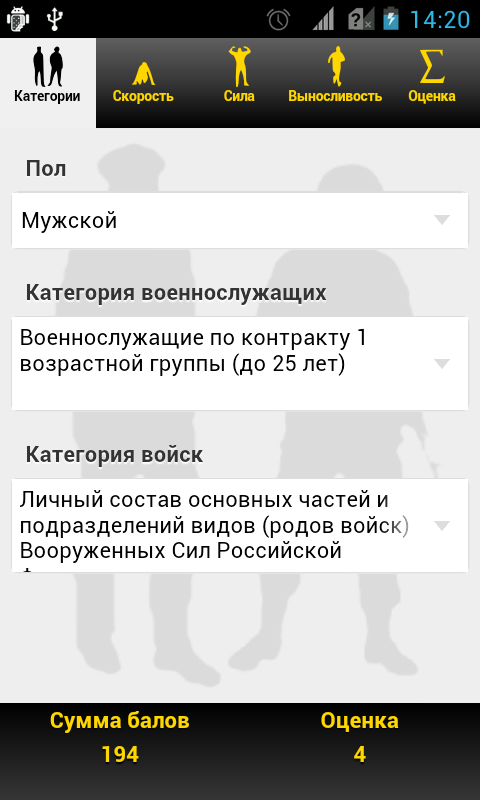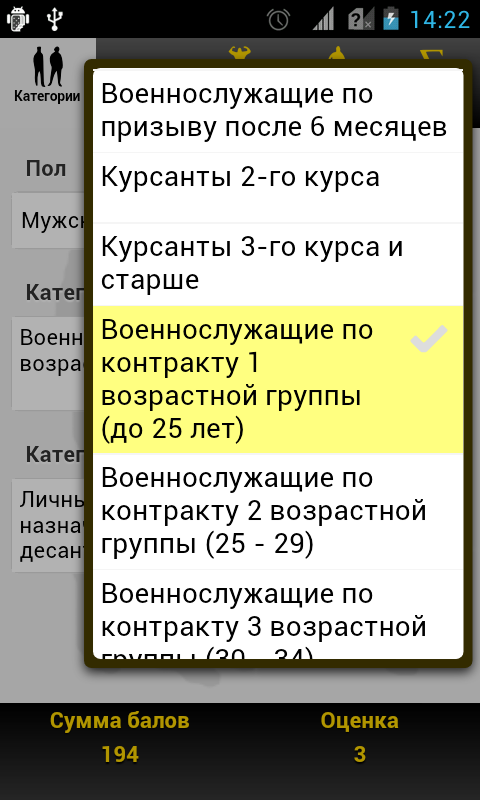 Оценка индивидуальной физической подготовки по 3 упражнениям согласно НФП 2013 ВС РФ. Включены следующие упражнения: скорость: бег на 60 м, бег на 100 м; сила: подтягивание на перекладине, подъем переворотом на перекладине, наклоны туловища вперед, приседание, сгибание и разгибание рук в упоре лежа; выносливость: бег на 1 км, бег на 3 км. При выборе упражнений и расчете оценки учитывается принадлежность к категории военнослужащих и категории войск.