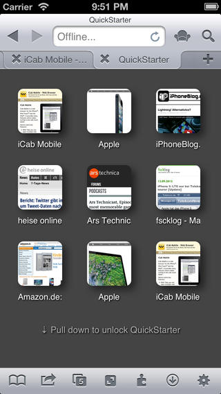 iCab Mobile поддерживает вкладки. Обзор панели Tab позволяет переключаться между вкладками, удалить их или открыть новые. Вы также можете открывать ссылки в новых вкладках (как в фоновом режиме или на переднем плане), или пусть iCab Mobile спросить, где открыть ссылку. Все это можно настроить отдельно для ссылки, которые открывают страницы с того же домена или связей с открытой страницы из другого домена. При выходе, все вкладки сохраняются, их можно открыть в автономном режиме, когда не доступен Интернет. Закладки могут быть организованы в папки. Вы можете легко импортировать / экспортировать закладки из / ПК / Mac браузер. Закладки можно также сохранить как “Автономные Закладки”. Эти закладки могут быть открыты без подключения к интернету. Это простой способ сохранить веб-страницы.