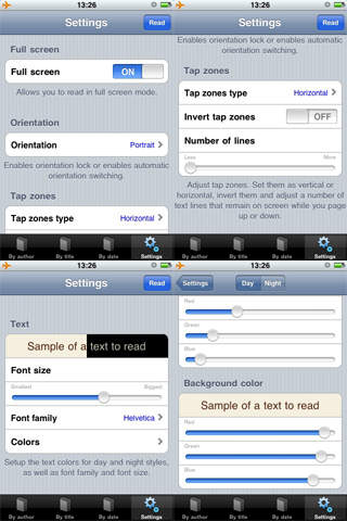 - Настраиваемые тап-зоны для навигации по книгам