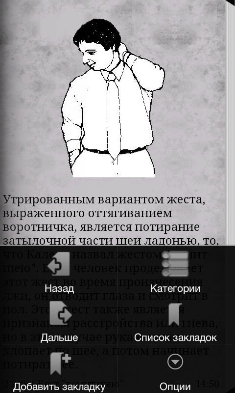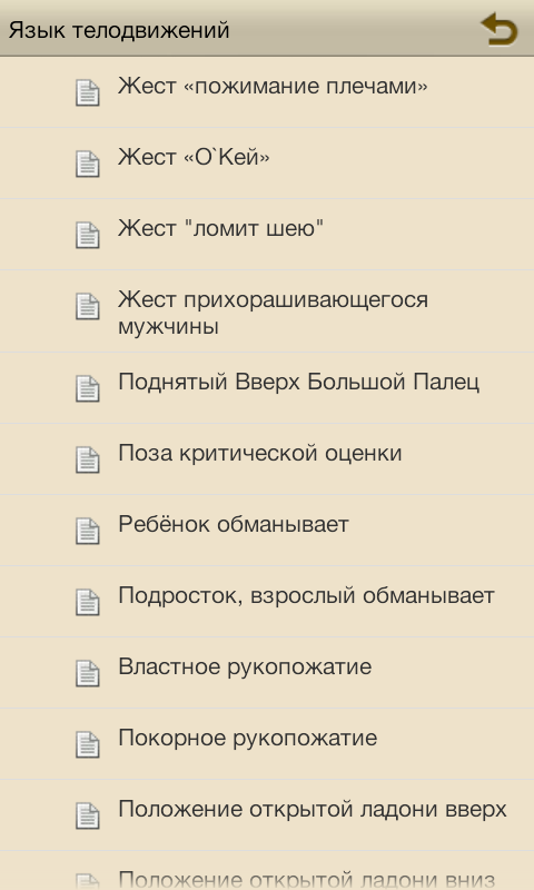 С помощью данного приложения Вы сможете с лёгкостью прочитать мысли людей по их жестам. В приложении приведено большое количество жестов с рисунками и их описанием. Данное приложение основано на известной книге - бестселлере Аллана Пиза - "Язык телодвижений". Вы можете настроить приложение на свой вкус: выбрать фоновый цвет, цвет текста, размер шрифта, дневной или ночной режим, для более удобного просмотра.