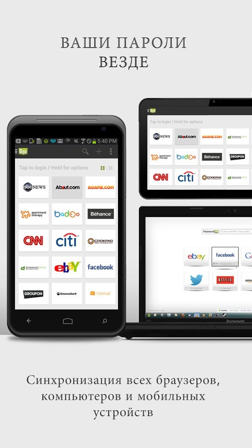 PasswordBox® работает со всеми интернет-браузерами, включая Chrome, Firefox, Safari и Internet Explorer. Сохраняйте пароли в PasswordBox так же, как в DropBox, и вы сможете сразу же пользоваться ими во всех своих браузерах, на всех компьютерах, планшетах и телефонах.